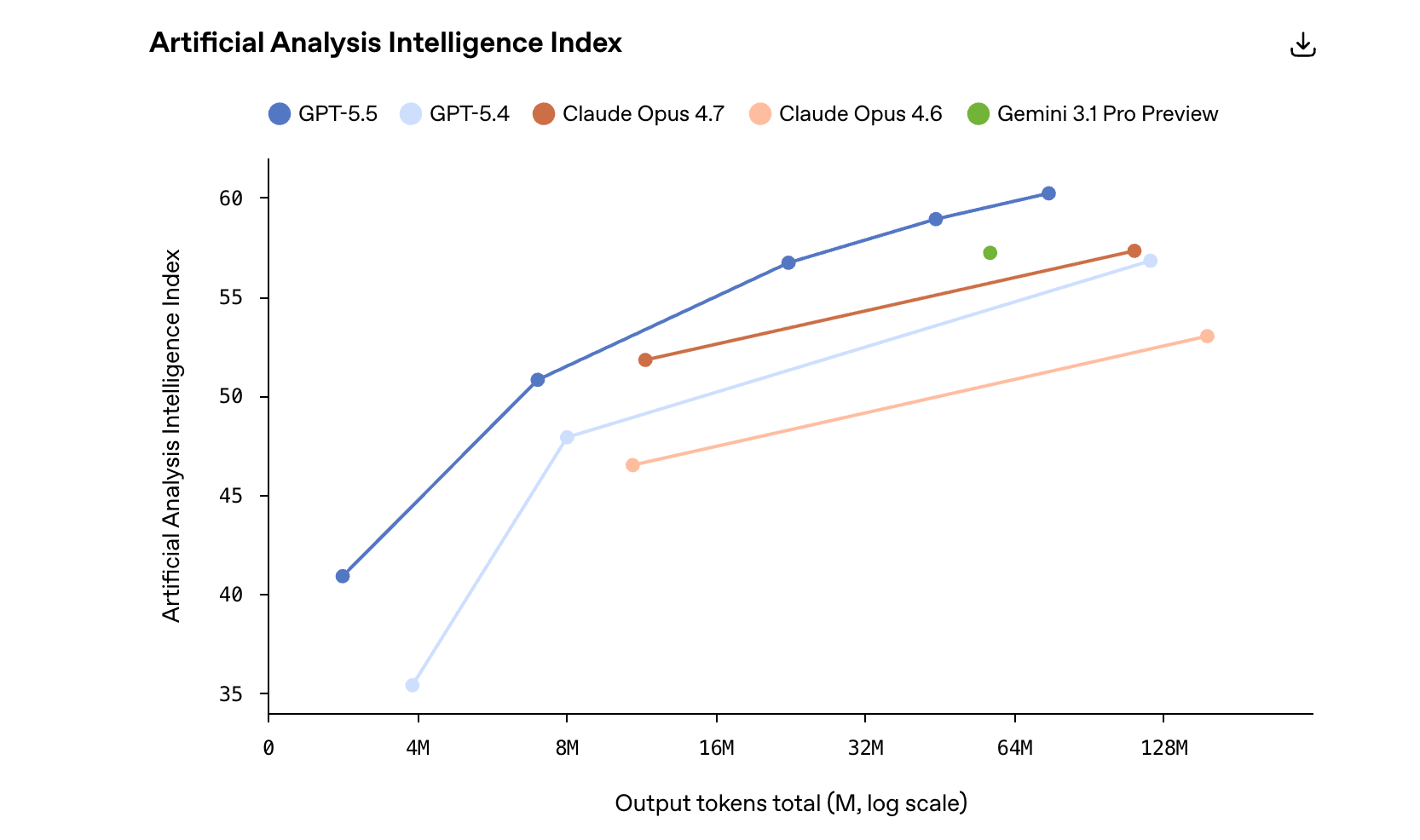 在这些领域中,GPT-5.5 的提升体现在智能水平和问题处理效率上,常常以更少 token 和更少重试获得更高质量输出。在 Artificial Analysis 的 Coding Index 上,GPT-5.5 以竞争性前沿编码模型一半的成本实现了最先进的智能水平。