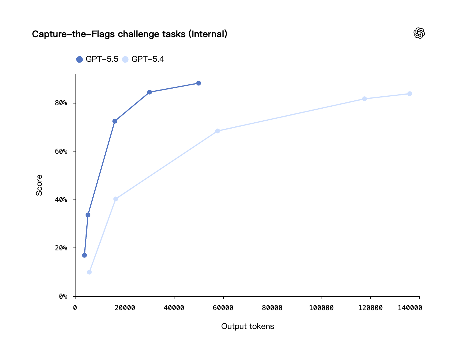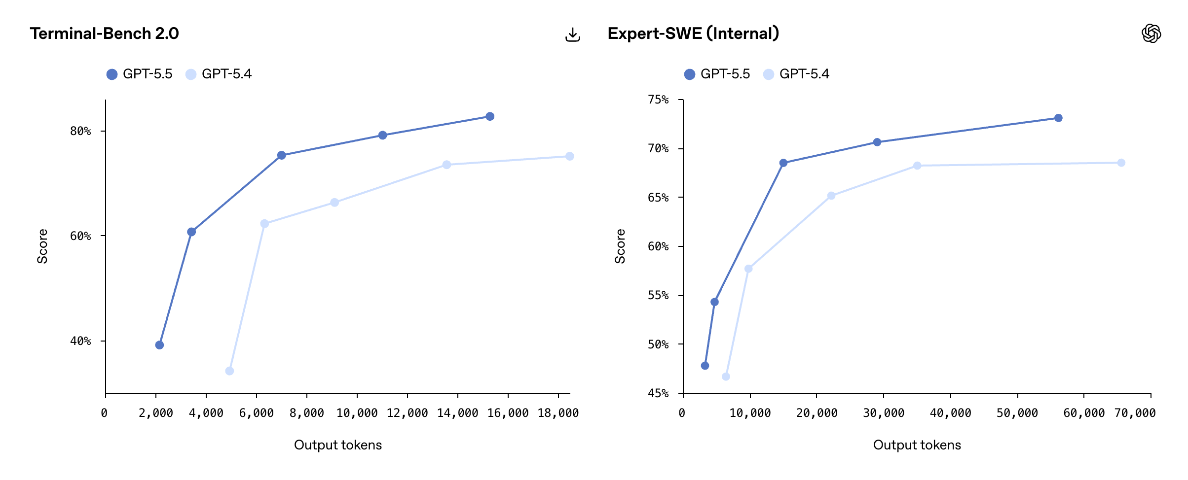 在三项评测中,GPT-5.5 均在使用更少 token 的同时提升了 GPT-5.4 的分数。