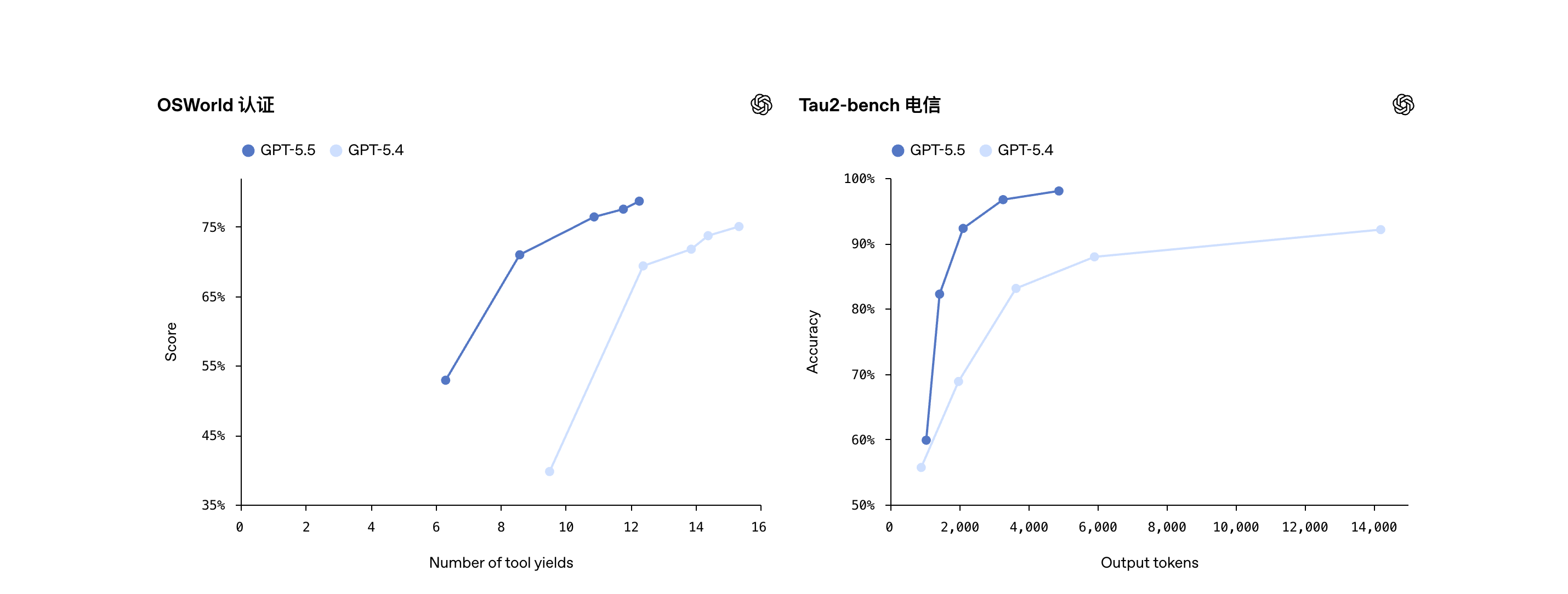 Tau2-bench Telecom 在无提示词调优条件下运行,并使用 GPT-4.1 作为用户模型。GPT-5.5 比前代模型更理解任务意图,也更节省 token。