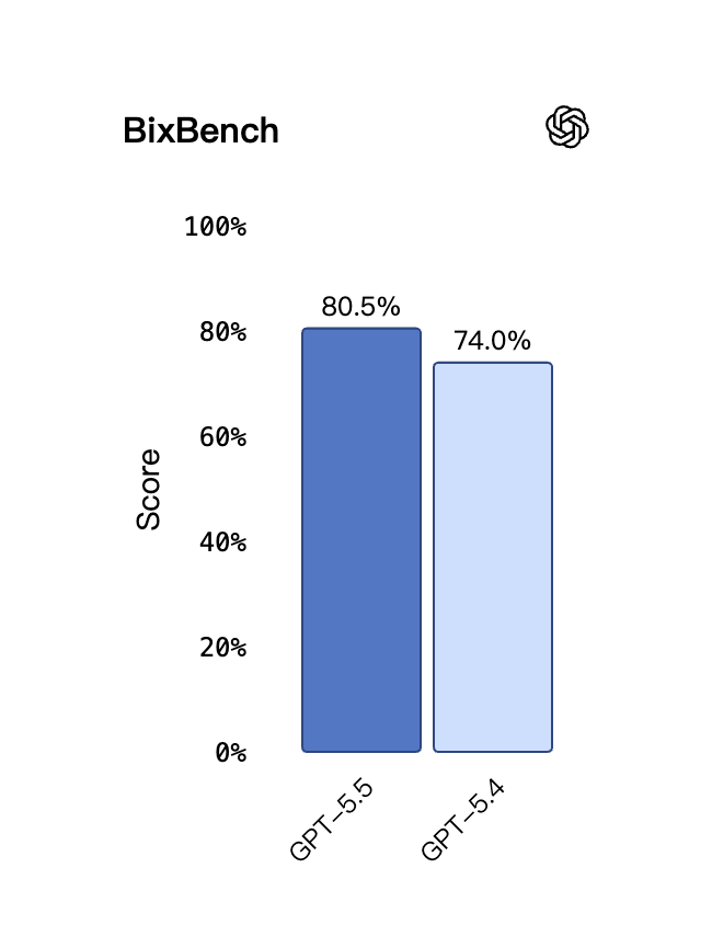 类似地,在围绕真实生物信息学和数据分析设计的 BixBench 上,GPT-5.5 在已发布成绩的模型中取得领先表现。该模型的科学能力已经强到可以作为真正的共同科学家,在生物医学研究前沿实质性加速进展。